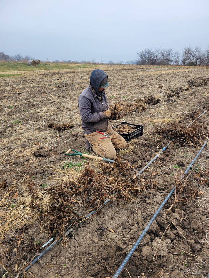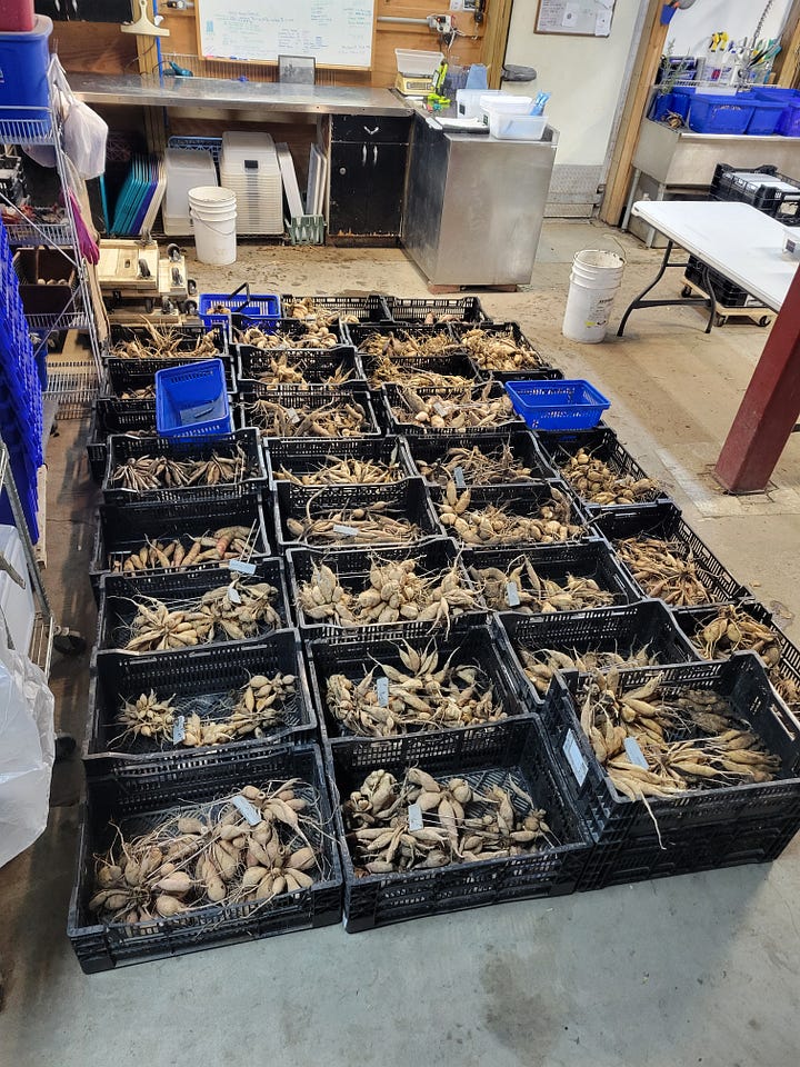 The dahlias were a slower, two-person operation with just Danielle and me. It took us about two weeks to dig, wash, divide, label, and store more than 600 plants. It’s a massive job, and no one should ask how I feel about dahlias while we’re in the middle of it. But when those blooms open next summer, when a customer gasps at Danielle’s bouquets, or someone shares photos of their flowers from the tubers they bought from us, it will all be worth it.