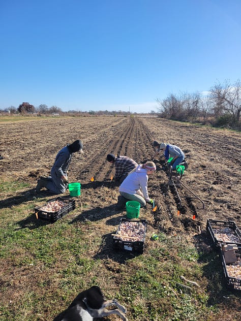 We hustled ahead of the cold to finish two of the biggest fall tasks: getting the garlic in and the dahlias out. Thanks to our farm crew plus several veteran members, we planted and mulched about 2,000 row feet of garlic in one afternoon. A huge thanks to everyone who pitched in!