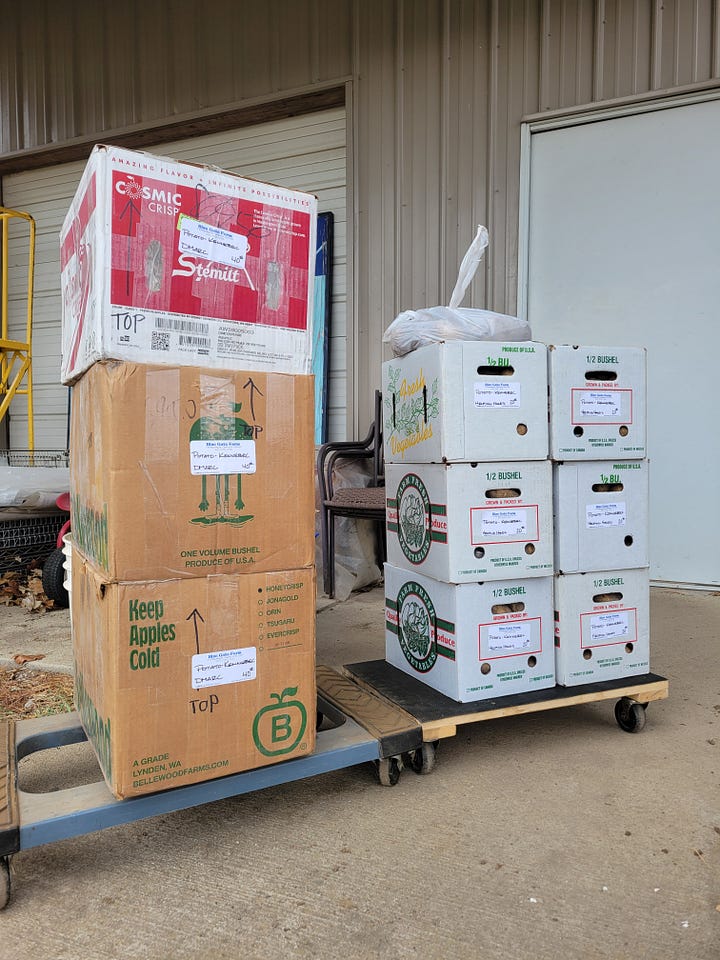 Caring for our communities is just as important—though, honestly, sometimes the land is easier. In years past we’ve donated eggs or produce to our local food bank. This month we tried something new. We committed to “Share the Bounty” by donating 100 pounds of potatoes to local food pantries, then invited our VegEmail customers to add to that total. Thanks to their generosity, on November 18th we delivered 245 pounds of potatoes to food banks in Des Moines and Knoxville. We plan to do it again in December. Connection fuels reciprocity; reciprocity fuels connection. It’s a cycle worth tending and together we can make a bigger difference in our communities and on the land.